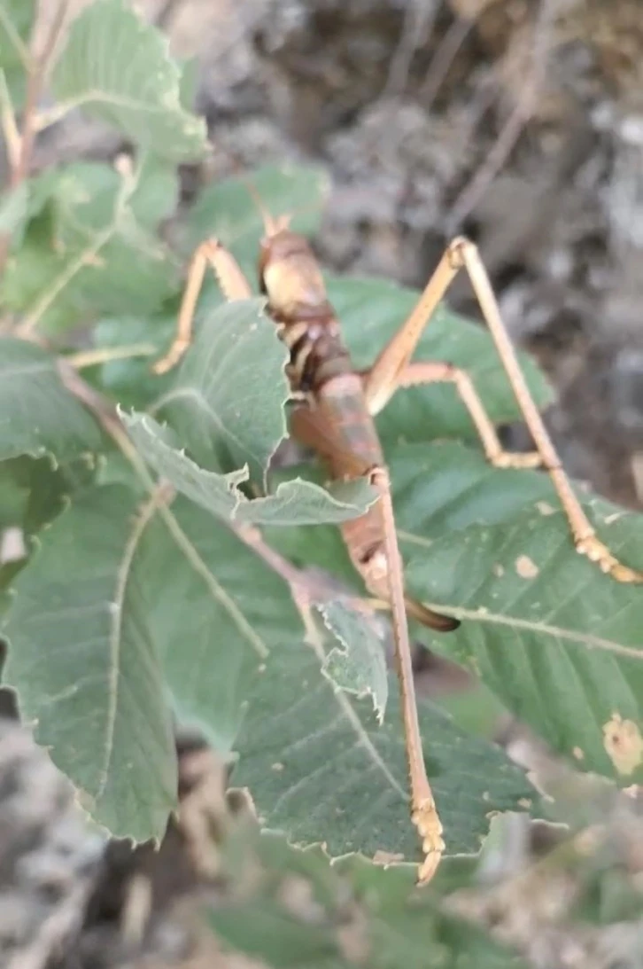 Diyarbakır’ın Silvan ilçesinde meşe ağacı yaprağında dev etçil çekirge görüntülendi.