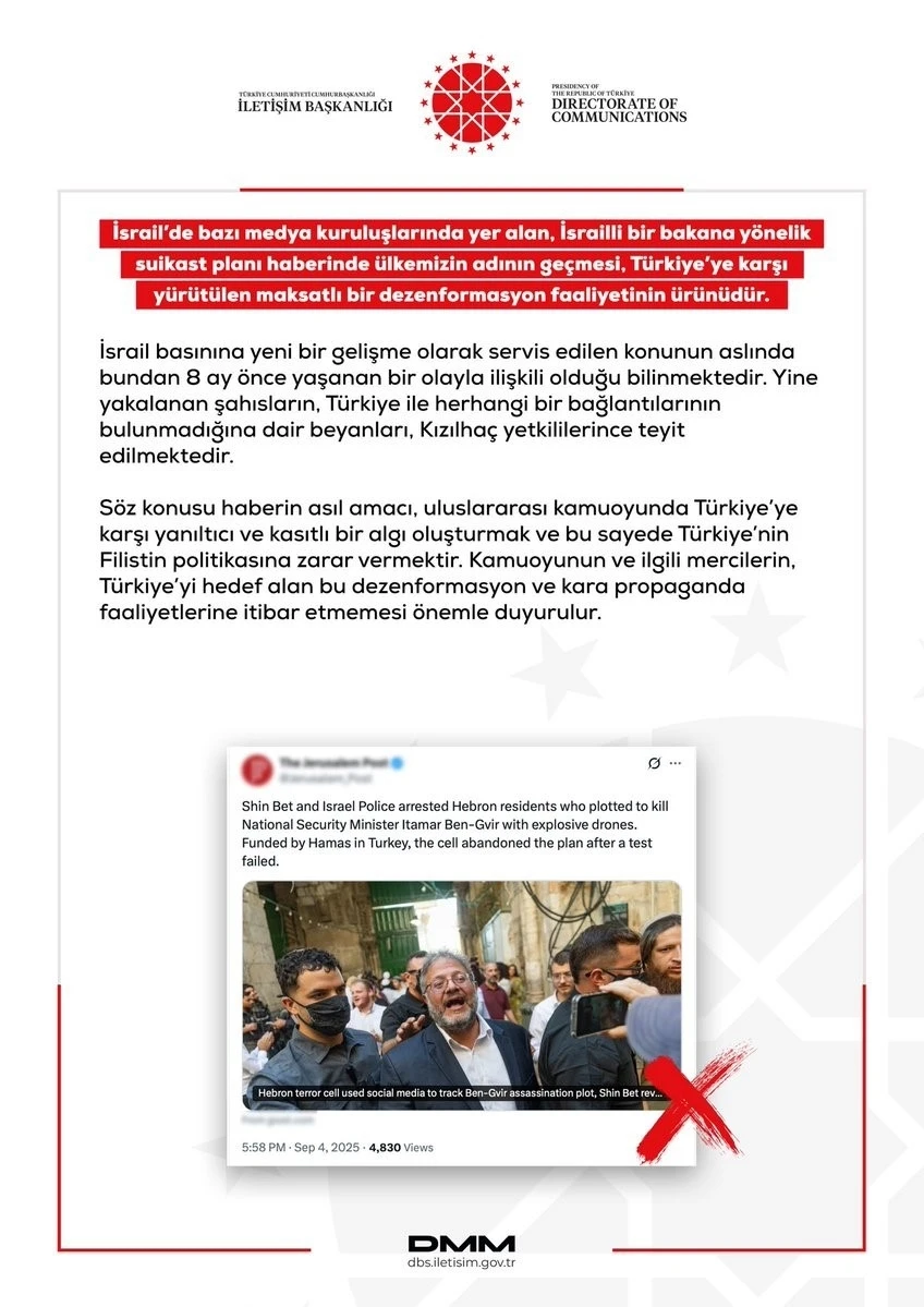 DMM’nin sosyal medya hesabından yapılan açıklamada, "İsrail’de bazı medya kuruluşlarında yer alan, İsrailli bir bakana yönelik suikast planı haberinde ülkemizin adının geçmesi, Türkiye’ye karşı yürütülen maksatlı bir dezenformasyon faaliyetinin ürünüdür. İsrail basınına yeni bir gelişme olarak servis edilen konunun aslında bundan 8 ay önce yaşanan bir olayla ilişkili olduğu bilinmektedir. Yine yakalanan şahısların, Türkiye ile herhangi bir bağlantılarının bulunmadığına dair beyanları, Kızılhaç yetkililerince teyit edilmektedir. Söz konusu haberin asıl amacı, uluslararası kamuoyunda Türkiye’ye karşı yanıltıcı ve kasıtlı bir algı oluşturmak ve bu sayede Türkiye’nin Filistin politikasına zarar vermektir. Kamuoyunun ve ilgili mercilerin, Türkiye’yi hedef alan bu dezenformasyon ve kara propaganda faaliyetlerine itibar etmemesi önemle duyurulur" ifadelerine yer verildi.