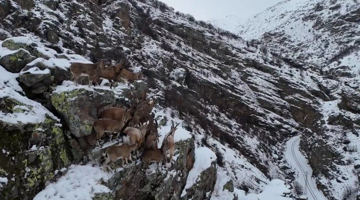 Avlanması yasak olan ve koruma altındaki dağ keçilerine, Bayburt’un yüksek rakımlı bir köyünün dağlarında denk gelindi. Doğanın uzman tırmanıcıları olarak bilinen, dağları süsleyen dağ keçileri, farklı zamanlarda aynı güzergahtan geçen İrem Koçak ve Uğur Türk isimli vatandaşların dikkatini çekti. İlk defa bu kadar yakından dağ keçilerini gören Koçak ve Türk, keçileri cep telefonu kamerasıyla görüntülediler. Koçak, dağ keçilerini doğası ve temiz havası olan köyün araç yolunda gördüğünü söyledi. Türk ise, keçilere farklı zamanda aynı yol güzergahında rastladığını, ilk defa gördüğü için cep telefonuyla kaydettiğini belirtti. Hem drone, hem de cep telefonu kamerasına yansıyan görüntülerde keçilerin karlı, engebeli, sarp araziyi kolaylıkla inip çıktığı görülüyor.