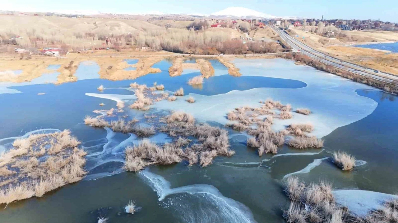 Bitlis’in Ahlat ilçesinde bulunan ve şiddetli soğuk nedeniyle kısmi olarak donan Vali Uğur Boran Kuş Cenneti havadan görüntülendi.