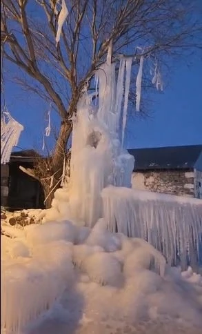 Ardahan merkeze bağlı Çimenkaya köyü ile Uzunova köyü arasında patlayan su hattından fışkıran su, hava sıcaklığının sıfırın altında seyretmesi nedeniyle donarak dev bir buz kütlesi oluşturdu. Ortaya çıkan görüntü, adeta buzdan bir heykeli andırırken vatandaşların da ilgisini çekti.