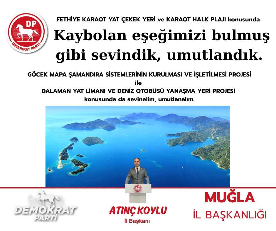 Demokrat Parti (DP) Muğla İl Başkanı Atınç Koylu, AKP Muğla İl Başkanı Haluk Laçin’e hitaben kaleme aldığı açık mektupla, Fethiye Karaot Yat-Çekek Yeri Projesi ve Göcek Koyları’ndaki Mapa-Şamandıra Sistemi üzerine önemli uyarılarda bulundu. Koylu, projelerin yerel unsurlarla birlikte ve şeffaf bir şekilde yürütülmesi gerektiğini vurguladı.