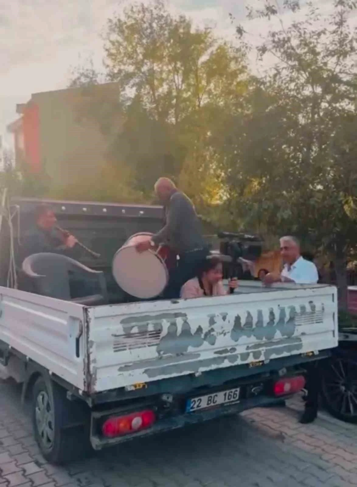 Edirne’de düğün alayında kamyonetin aniden hareket etmesi sonucu kamyonetin kasasındaki davulcu, kameramanın üstüne düştü. O anlar kameraya yansıdı.