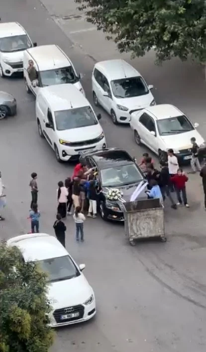 İstanbul Esenyurt’ta çocuklar, gelin ve damattan zarf almak için düğün konvoyunun önünü çöp konteyneri ile kesti. O anlar kameraya yansıdı.