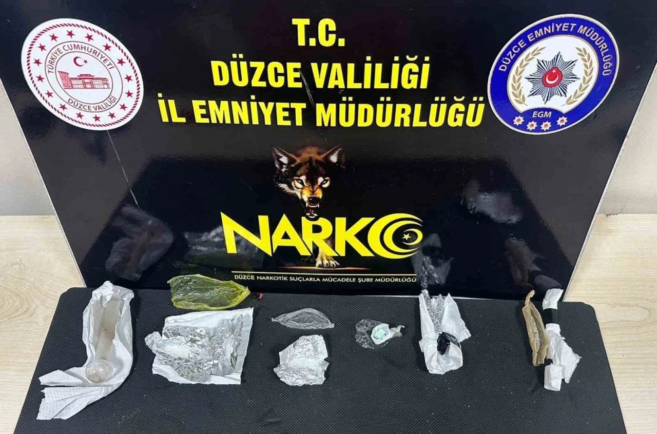 Düzce Cumhuriyet Başsavcılığı koordinesinde Narkotik Suçlarla Mücadele Şube Müdürlüğü ekiplerince uyuşturucu madde ticaretinin önlenmesine yönelik çalışmalar sürüyor. Bu kapsamda ekipler tarafından yapılan operasyonda 6 parça halinde toplam 10 gram metamfetamin Maddesi ve 2 adet exacy hap ele geçirildi.