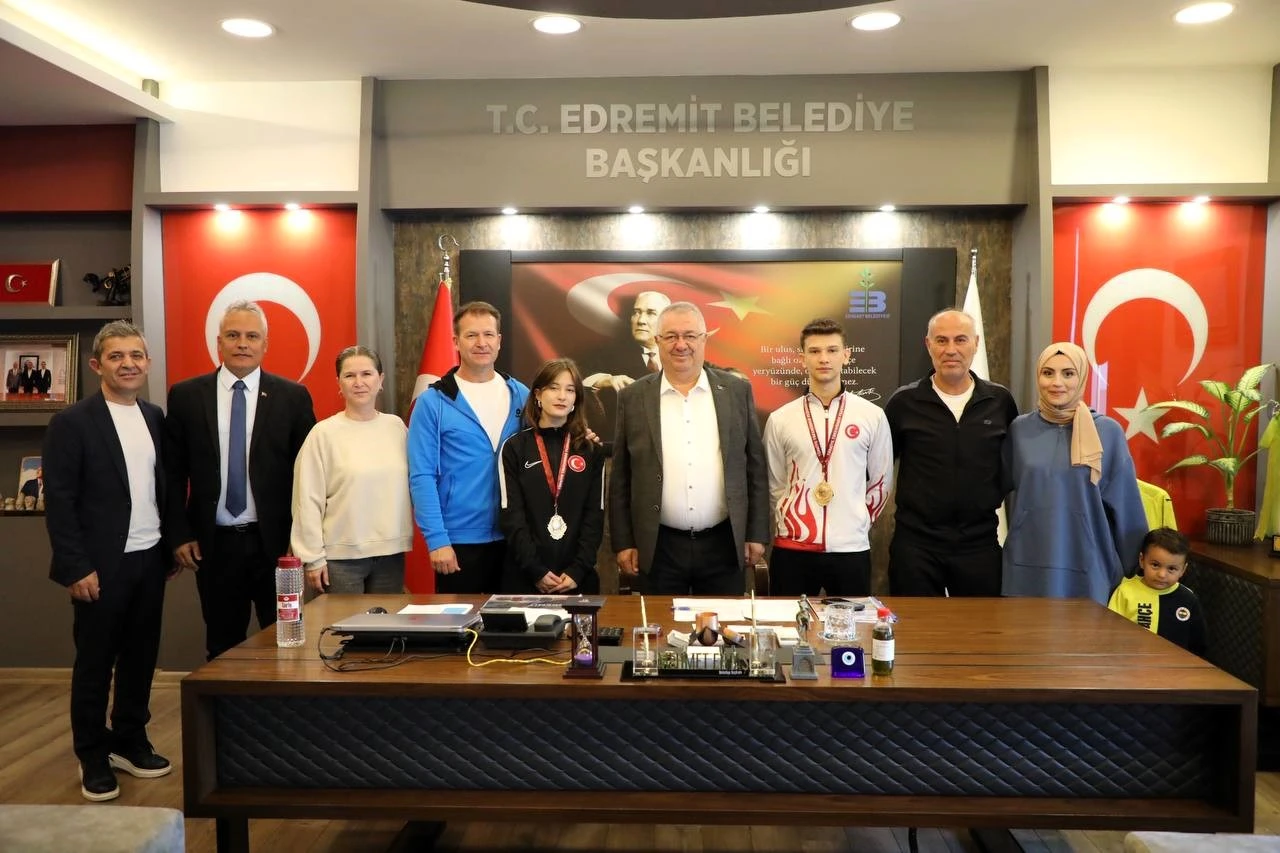 Şampiyonada toplamda 4 altın madalya kazanarak büyük bir başarıya imza atan sporcular, madalyalarıyla Edremit Belediye Başkanı Mehmet Ertaş’ı ziyaret etti. Antrenörler ve ailelerin de yer aldığı ziyarette, Başkan Ertaş sporcuları tebrik ederek başarılarının devamını diledi. Edremit, bir kez daha spor alanındaki başarılarıyla gururlandı.