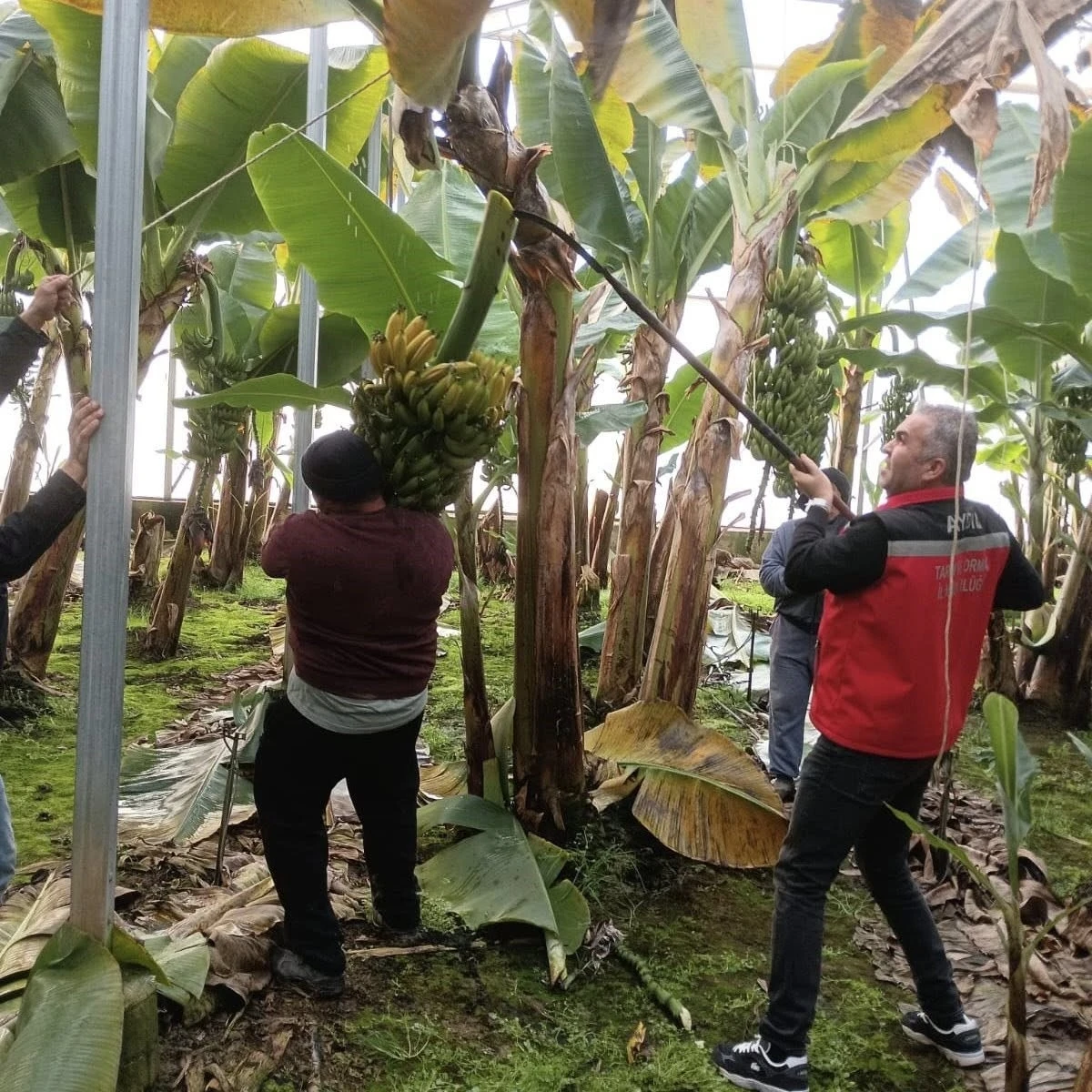 Aydın’ın Efeler ilçesine bağlı Dalama Mahallesi’nde muz hasadı gerçekleştirildi. Efeler İlçe Tarım ve Orman Müdürlüğü’nün de katıldığı hasat programında, üretici Hakan Özer’in muz bahçesi ziyaret edildi. Yaklaşık 5 yıldır 4 dekar alanda muz yetiştiriciliği yapan Hakan Özer’in bahçesinde 700 adet muz ağacı bulunurken, Özer normal şartlarda sezonda 26-27 ton civarında muz üretimi gerçekleştiriyor. Hasada katılan Efeler İlçe Tarım ve Orman Müdürü Mehmet Esen de üreticiyle birlikte muzları hasat ederken, bereketli bir yıl temennisinde bulundu.
