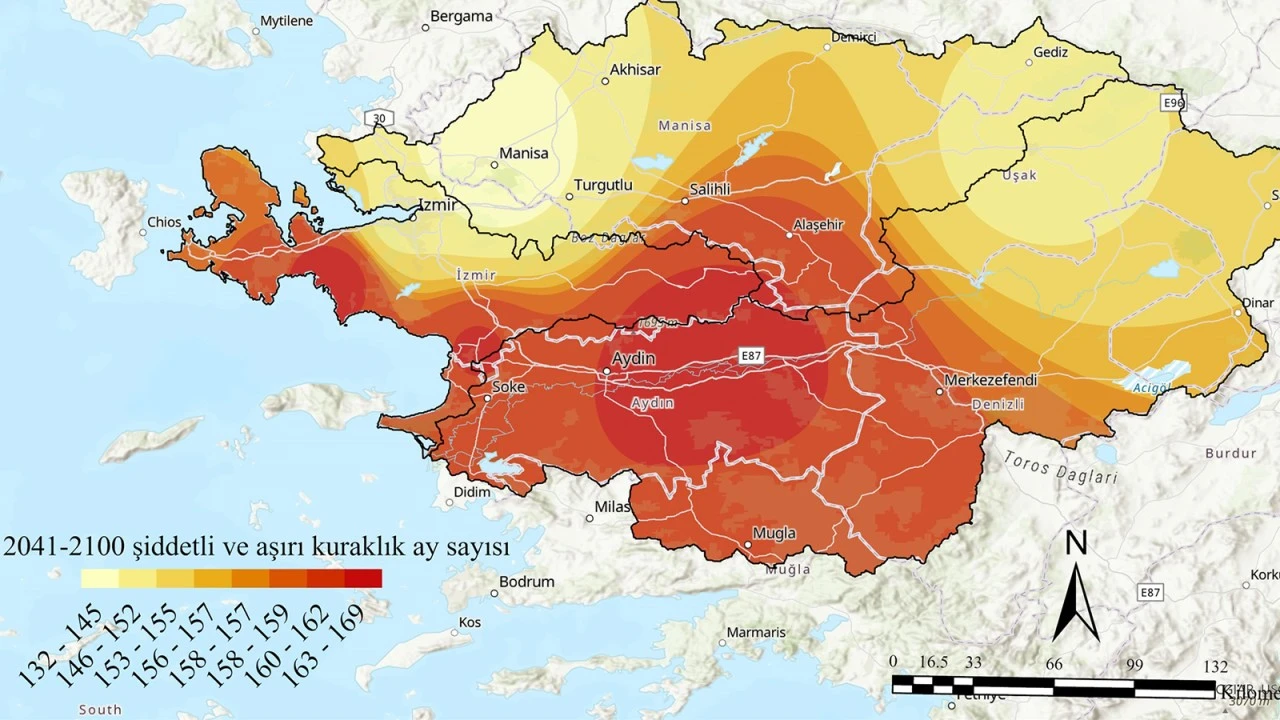 Araştırma, 2041-2100 döneminde şiddetli ve aşırı kuraklık ayı sayısının en yüksek olduğu bölgelerin Büyük Menderes Havzası (Aydın-Denizli-Muğla hattı) ile Küçük Menderes Havzası’nın batı kesimleri (Çeşme, Seferihisar, Selçuk ve çevresi) olduğunu gösteriyor. Bu alanlarda toplam 160 ayın üzerine çıkan kuraklık değerleri dikkat çekiyor. Küçük Menderes’in doğu kesimlerinde ve Gediz Havzası’nda ise kuraklık riski devam ediyor. Orta emisyon senaryosuna göre 2070-2099 arasında kurak ay sayısında yüzde 26 artış öngörülürken, yüksek senaryoda bu oran yüzde 40’a yaklaşıyor.