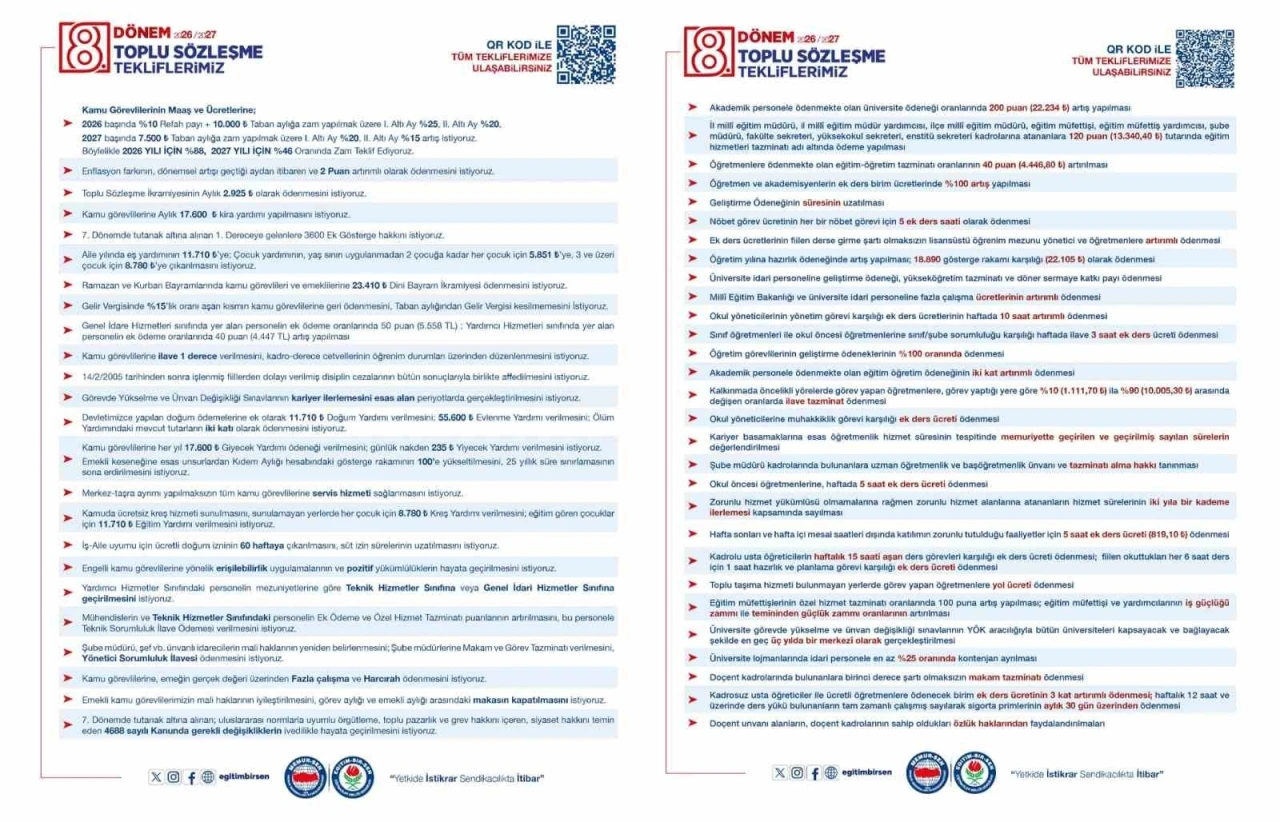 Memur-Sen tarafından 2026-2027 yıllarını kapsayan 8. Dönem Toplu Sözleşme sürecinde kamuoyuyla paylaşılan tekliflerden bazıları ise şu şekilde: