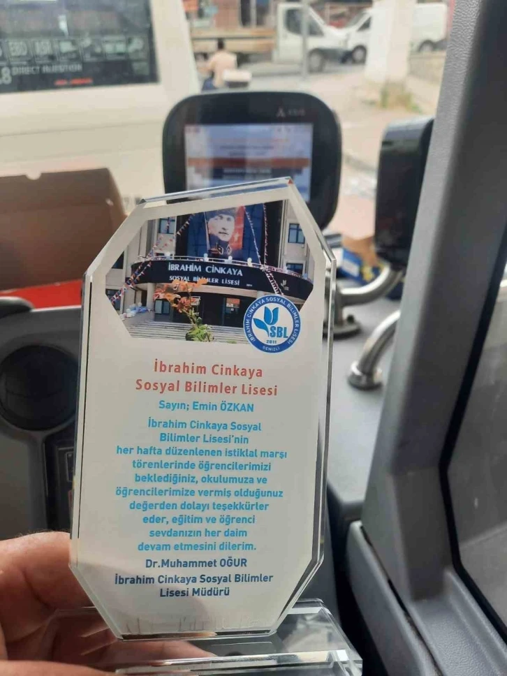 Halk Otobüsü şoförü Emin Özkan’a plaket takdim edildi. Denizli Büyükşehir Belediyesi Ulaşım Hizmetlerinde 190 numaralı hatta Halk Otobüsü şoförlüğü yapan Emin Özkan’a, İbrahim Cinkaya Sosyal Bilimler Lisesi Müdürü Muhammet Oğur tarafından plaket takdim edildi.