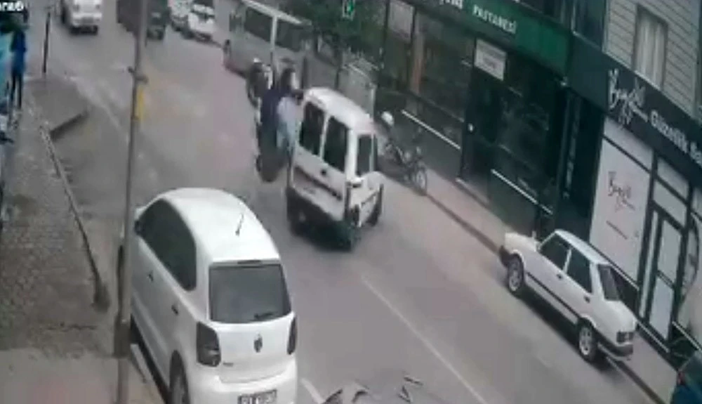 Bursa’nın İnegöl ilçesinde meydana gelen kazada hafif ticari araç ile çarpışan motosikletin sürücüsü yaralandı. Kaza anı bir iş yerinin güvenlik kamerasına saniye saniye yansırken, ehliyetsiz çıkan motosiklet sürücüsü 18 bin lira cezadan kaçamadı.