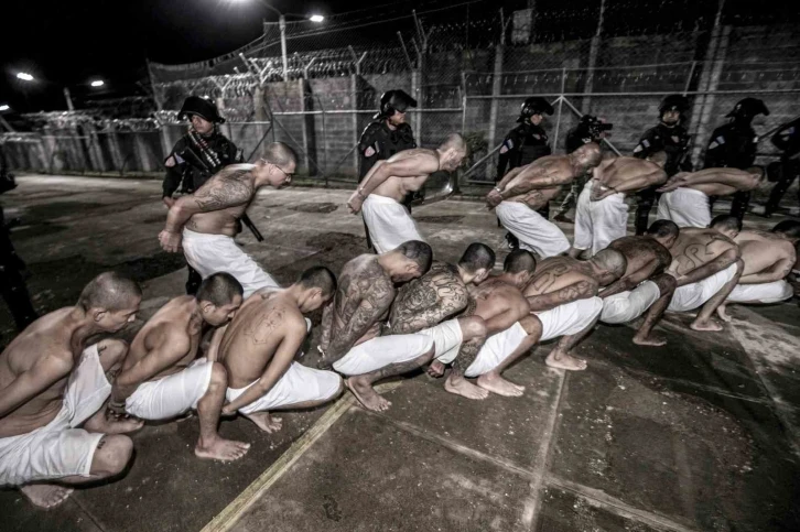 Paylaşılan görüntülerde saçları kazınmış, dövmeli ve beyaz şortlu çete üyelerinin elleri arkadan kelepçeli şekilde dev hapishaneye götürüldüğü anlar yer aldı.