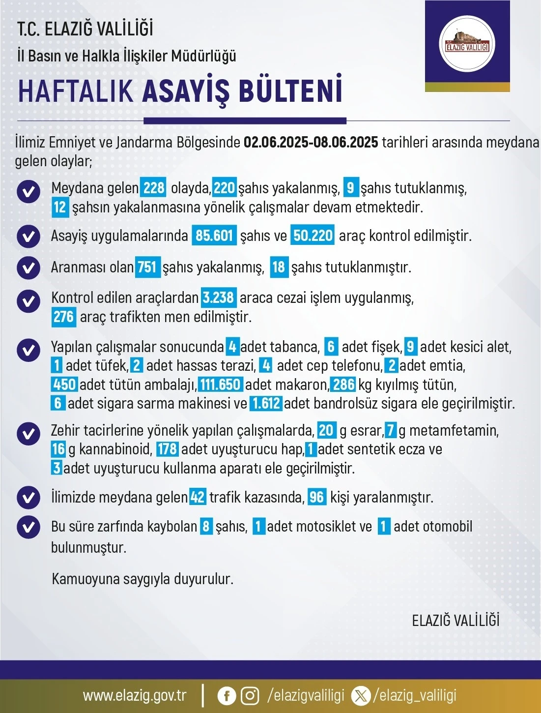 Elazığ Valiliği, son 1 haftalık asayiş verilerini paylaştı. Buna göre son bir haftada 228 olay meydana gelirken, 220 şahıs yakalandı ve şahıslardan 9’u tutuklanarak cezaevine gönderildi. Asayiş uygulamalarında 85 bin 601 şahıs ve 50 bin 220 araç kontrol edildi. Aranması olan 751 şahıs yakalanırken, 18 şahıs tutuklanarak cezaevine gönderildi. Kontrol edilen araçlardan 3 bin 238 araca cezai işlem uygulanırken 276 araç trafikten men edildi.