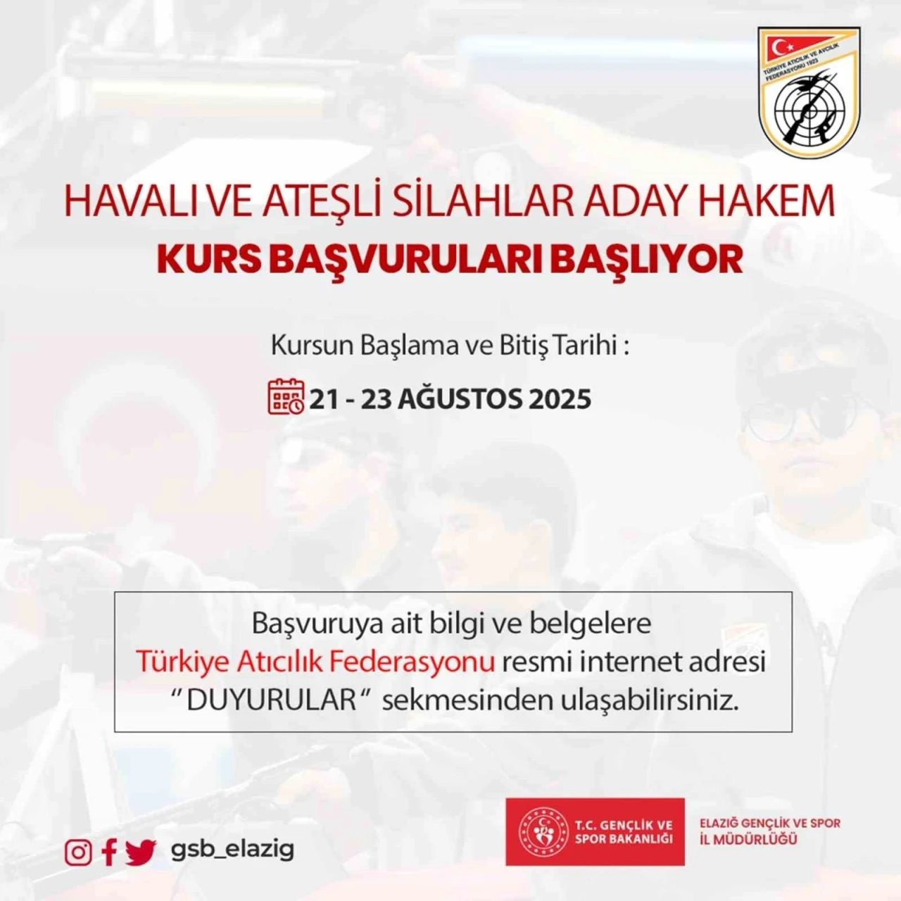 Elazığ’da havalı ve ateşli silahlar branşında aday hakem kursu açılacak. Elazığ Gençlik ve Spor İl Müdürlüğü koordinasyonunda, Türkiye Atıcılık ve Avcılık Federasyonu iş birliğiyle Havalı ve Ateşli Silahlar Aday Hakem Kursu 21-23 Ağustos 2025 tarihleri arasında Elazığ’da düzenlenecek. Atıcılık branşında hakemlik yapmak isteyen adaylara yönelik olarak açılacak bu kurs ile, hakem havuzunun genişletilmesi ve branşın ülke genelindeki organizasyon kalitesinin artırılması hedefleniyor. Kurs, hem teorik hem de uygulamalı eğitim içerikleriyle adaylara yetkinlik kazandırmayı amaçlıyor. Elazığ Gençlik ve Spor İl Müdürlüğü’nden yapılan açıklamada, "İlimizde sporun her alanında olduğu gibi hakemlik ve yöneticilik alanlarında da güçlenmeye devam ediyoruz. Bu doğrultuda düzenlenecek olan kursa, hakemlik kariyerine ilk adımı atmak isteyen tüm spor severleri başvuru yapmaya davet ediyoruz" denildi.