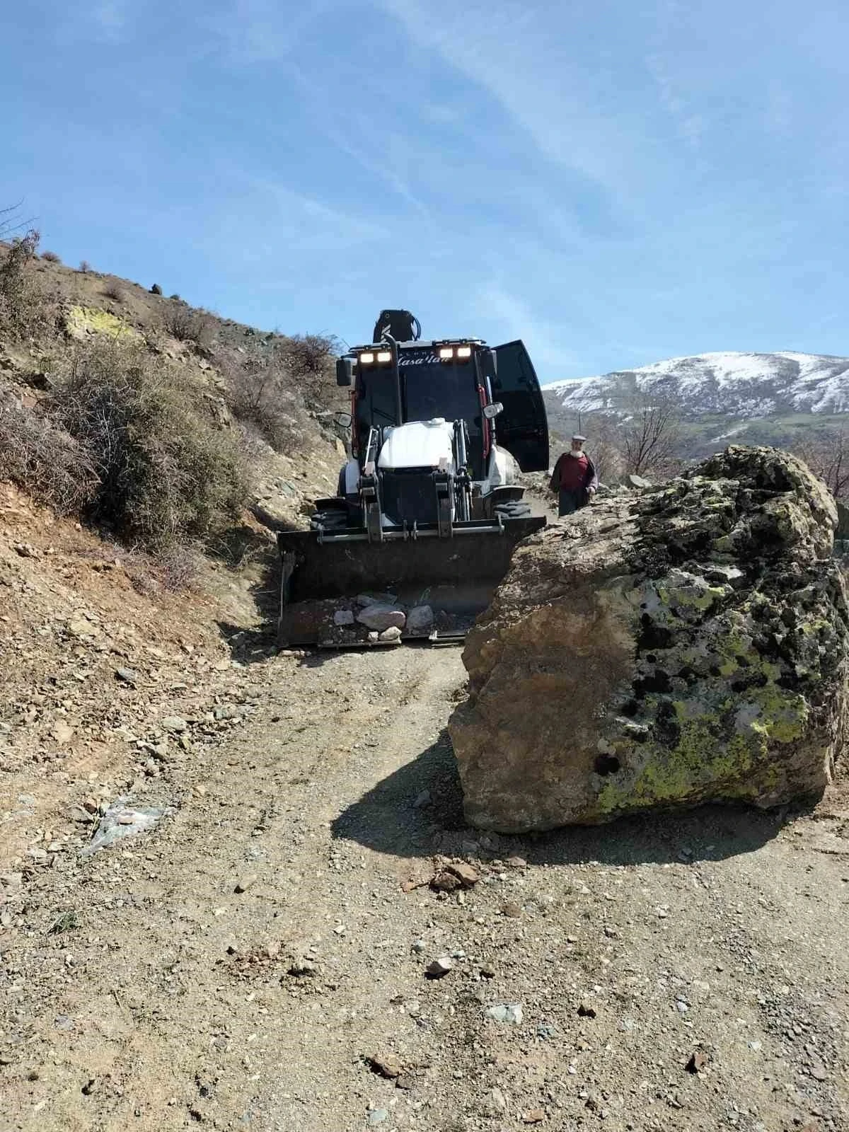 Elazığ’da etkili olan yağışlarla birlikte köy yoluna düşen kaya parçaları, ekipler tarafından kaldırıldı.
