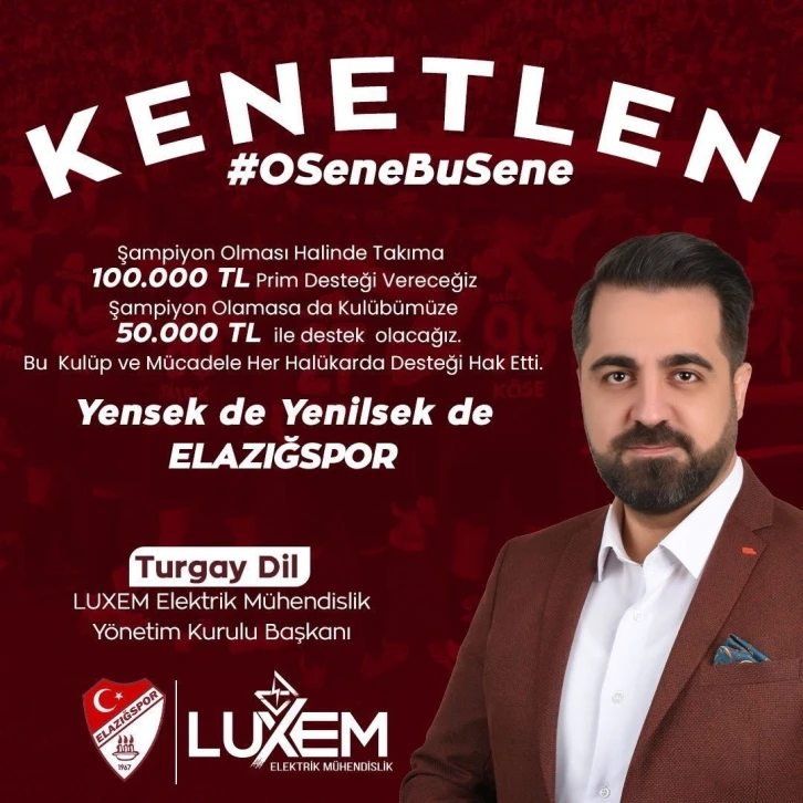 Luxem Elektrik Mühendislik Yönetim Kurulu Başkanı Turgay Dil’den Elazığspor’a destek açıklaması geldi. İyi günde de kötü günde de takımın yanında olmaları gerektiğini kaydeden Dil, şampiyon olması halinde takıma 100 bin liralık prim dağıtacaklarını söyledi. Dil, şampiyon olunmasa bile takıma 50 bin lira prim dağıtacaklarını vurguladı. Dil, ’’Bu kulüp desteği hak etti. Yensek de Elazığspor yenilsek de Elazığspor, biz her zaman takımımızın yanında olacağız’’ dedi.