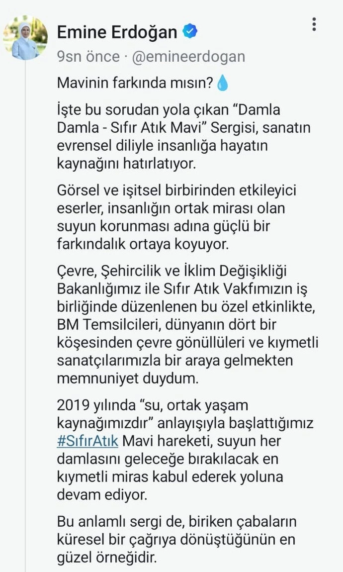 "2019 yılında ’Su, ortak yaşam kaynağımızdır.’ anlayışıyla başlattığımız Sıfır Atık Mavi hareketi, suyun her damlasını geleceğe bırakılacak en kıymetli miras kabul ederek yoluna devam ediyor. Bu anlamlı sergi de biriken çabaların küresel bir çağrıya dönüştüğünün en güzel örneğidir. Zira dünya genelinde her yıl oluşan 57 milyon ton plastik atığın yaklaşık 23 milyon tonu göllerimizi, nehirlerimizi, denizlerimizi kirletiyor. Dünyanın harekete geçme vakti geldi de geçiyor. Maviyi koruma iradesinin yalnızca bir çevre politikası değil, insanlığın ortak vicdanı haline gelmesini diliyor, sergide emeği geçen herkesi tebrik ediyorum."