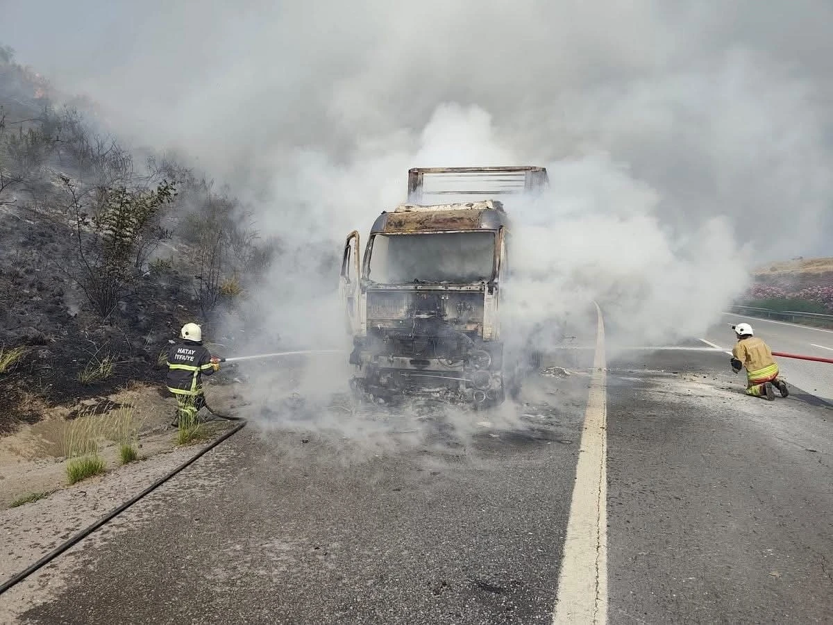Hatay’da seyir halindeyken alevlere teslim olan tır yanarak kullanılmaz hale geldi.