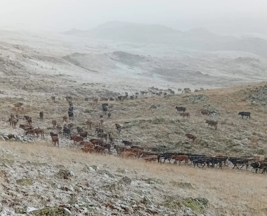 Erzurum’un Oltu ilçesinde yüksek kesimlere kar yağdı, sürülerini yaylada otlatan çobanlar zor anlar yaşadı.