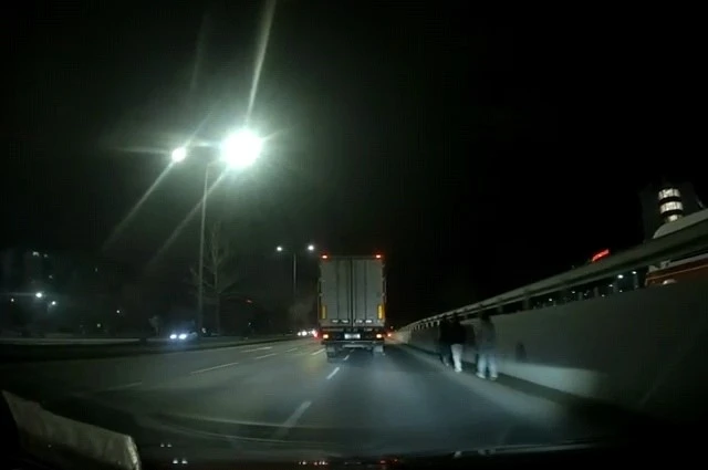 ? Ağır vasıta araçlarının ve otomobillerin yüksek süratle seyrettiği bölgede yürüyen şahısların, fark edilmelerini sağlayacak hiçbir reflektörlü kıyafet taşımamaları tehlikeyi iki katına çıkardı. O esnada yolda ilerleyen bir kamyon şoförü, karanlıkta adeta "görünmez" olan yayaları son anda fark etti. Şoförün dikkati ve ani manevrası sayesinde şahıslara çarpmaktan son saniyede kurtulduğu anlar, çevredeki vatandaşların kamerasına yansıdı. ?Metrelerce yan yana ilerlediler