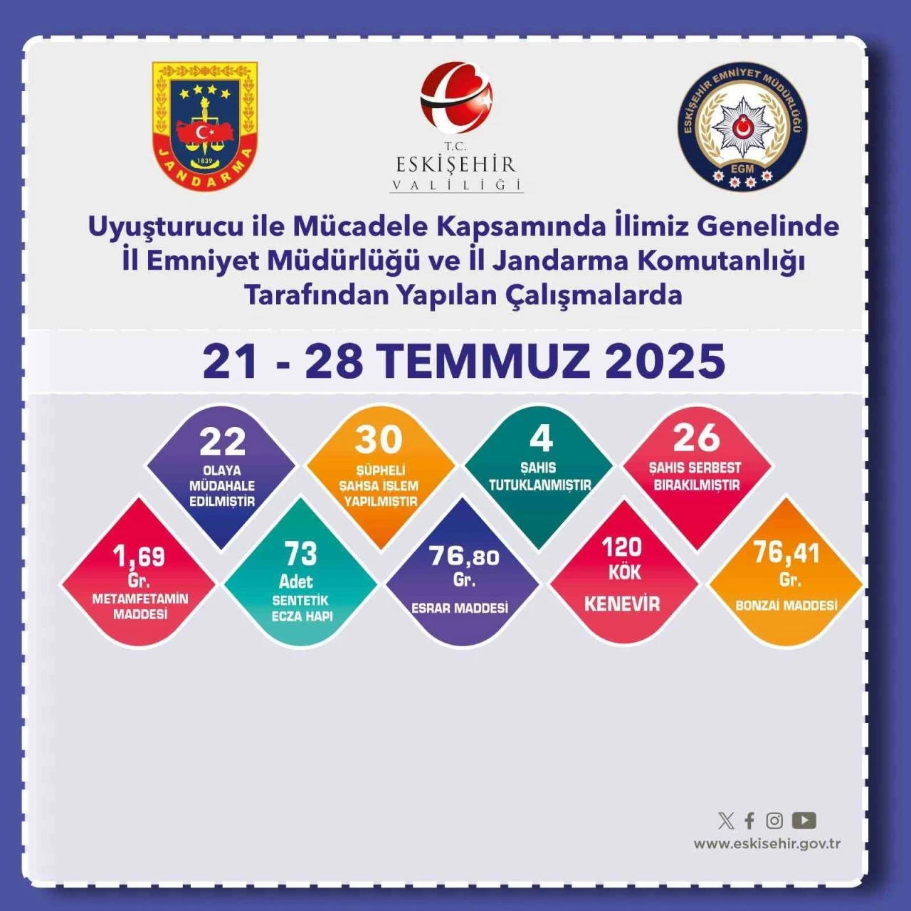 Eskişehir İl Emniyet Müdürlüğü ile İl Jandarma Komutanlığı ekipleri, 21-28 Temmuz 2025 tarihleri arasında uyuşturucuyla mücadele kapsamında yürüttükleri çalışmalarda önemli sonuçlar elde etti.
