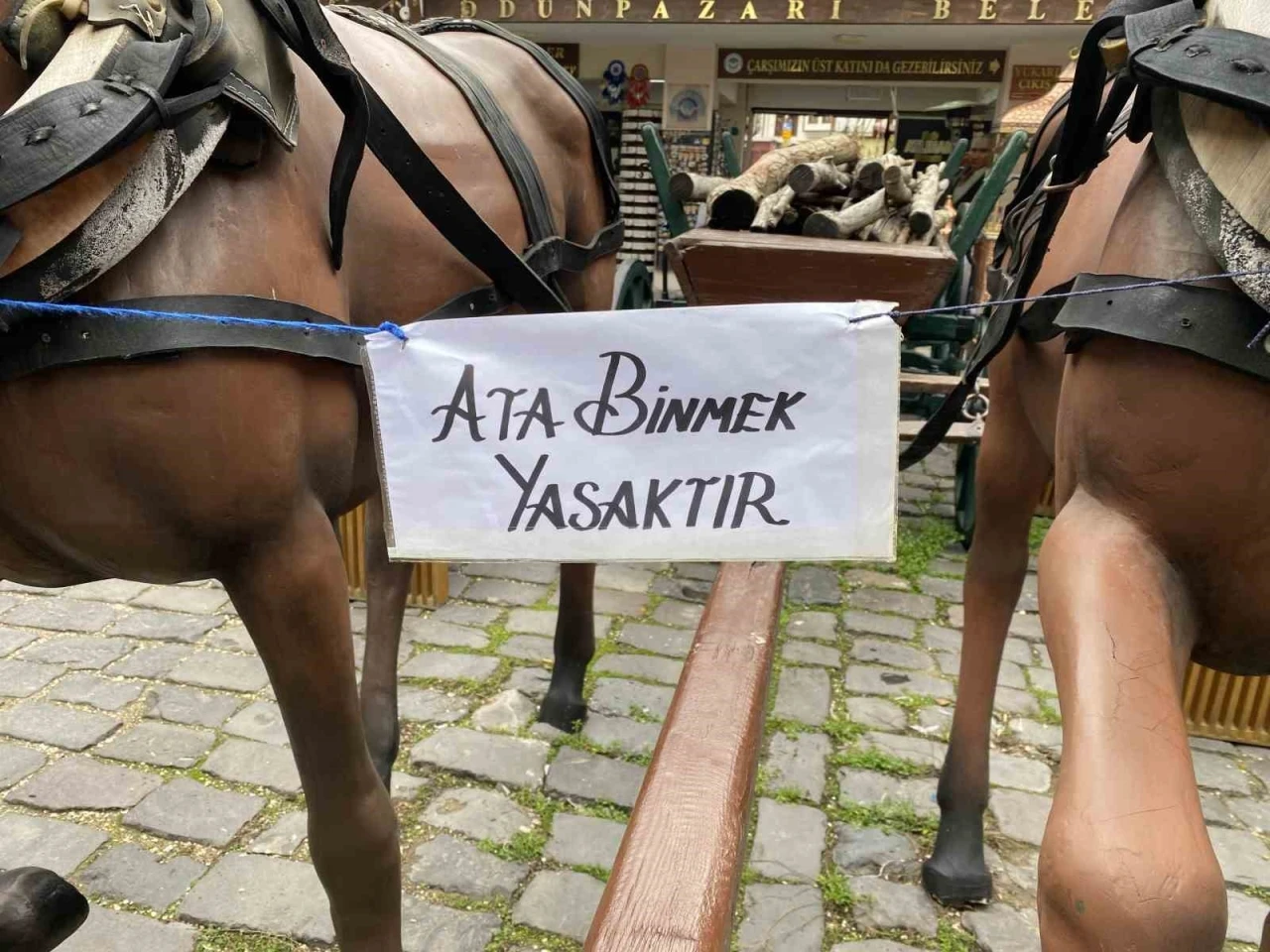 Eskişehir’de Atlıhan El Sanatları Çarşısı’nda bulunan at heykellerinin üzerine asılmış "Ata binmek yasaktır" şeklindeki ilginç uyarı yazısı vatandaşların dikkatini çekerken, ilginç görüntüler ortaya çıkarıyor.