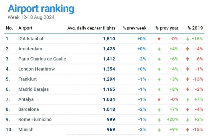 İstanbul Havalimanı, EUROCONTROL tarafından hazırlanan, 12-18 Ağustos 2024 dönemi hava trafik istatistiklerine göre günlük ortalama bin 510 uçuşla ilk sırada yer aldı. Listede Antalya Havalimanı’nın ise günlük ortalama bin 34 uçuş ile 7. sırada yer aldığı görüldü. Avrupa Hava Seyrüsefer Güvenliği Teşkilatı (EUROCONTROL) 12-18 Ağustos 2024 tarihleri arasındaki Avrupa Havacılık Genel Bakış Raporu’nu yayınlandı. Rapora göre İstanbul Havalimanı, bu dönemde günlük ortalama bin 510 uçuşla ilk sırada yer aldı. İstanbul’u sırasıyla bin 428 uçuşla Amsterdam Schiphol ve bin 412 uçuşla Paris Charles De Gaulle Havalimanı izledi. Avrupa’nın en yoğun havalimanlarının belirlendiği listede Antalya Havalimanı’nın günlük bin 34 uçuşla 7. sırada yer alması dikkat çekti. Türkiye, havalimanlarına iniş ve kalkış trafiklerinde ise günlük ortalama 3 bin 982 uçuş ile Avrupa’da en çok uçuş gerçekleştiren ilk 10 ülke arasında 6. sırada yer aldı.