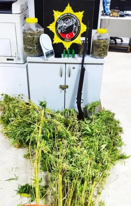 Çiğli İlçe Emniyet Müdürlüğü Suç Önleme Ve Soruşturma Büro Amirliğine bağlı ekipler, uyuşturucu madde ticareti yapan şahıslara yönelik çalışmalar çerçevesinde, H.K. (46) adlı bir kişinin, Karşıyaka ilçesi Cumhuriyet Mahallesinde bulunan ikametinden uyuşturucu yetiştirdiği, babasının ikametinde kurutarak satışa hazır hale getirdiği bilgisini edindi. Harekete geçen ekipler adreste yapılan aramada, 6 adet saksı içerisinde boyları yaklaşık 2 metre uzunluğunda kenevir bitkisi, 1 adet kavanoz içerisinde esrar maddesi ve 1 adet tek kırma av tüfeği ile 9 kartuş ele geçirildi. H.K.’nın babası olan K.K.’nin (64) evinde yapılan aramada ise, 1 adet 5 litrelik, 1 adet 10 litrelik bidonlar içerisinde 632 gram esrar maddesi ile 1 adet hassas terazi ele geçirildi.