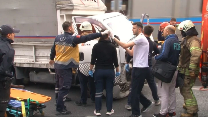 Eyüpsultan’da kamyon sürücüsü, çalışma yapan İBB’ye ait kamyonete çarptı. Çarpışma sonucu araç içerisinde sıkışan sürücüyü itfaiye ekipleri kurtardı.