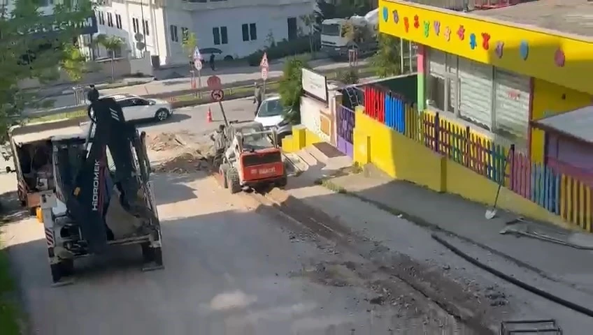 Bursa’da anaokulu önündeki sokaktaki altyapı çalışması esnasında, patlayan doğalgaz borusu herkesin yüreğini ağzına getirdi.
