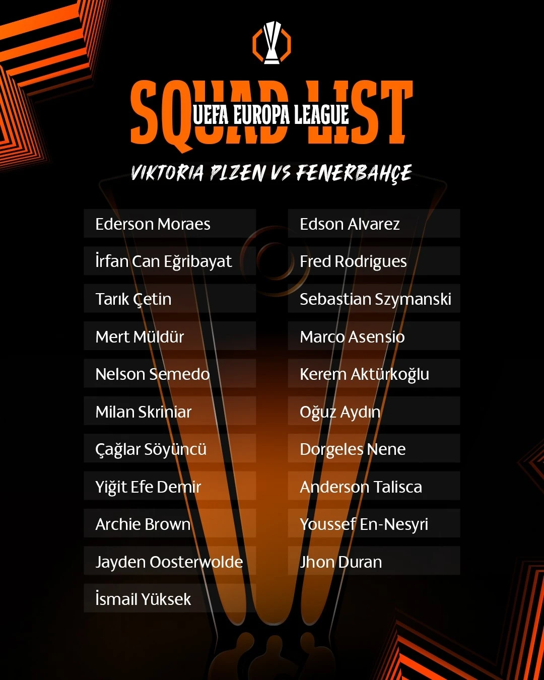 Fenerbahçe’nin, UEFA Avrupa Ligi 4. haftasında yarın deplasmanda Çekya ekibi Viktoria Plzen ile oynayacağı maçın kamp kadrosu belli oldu.