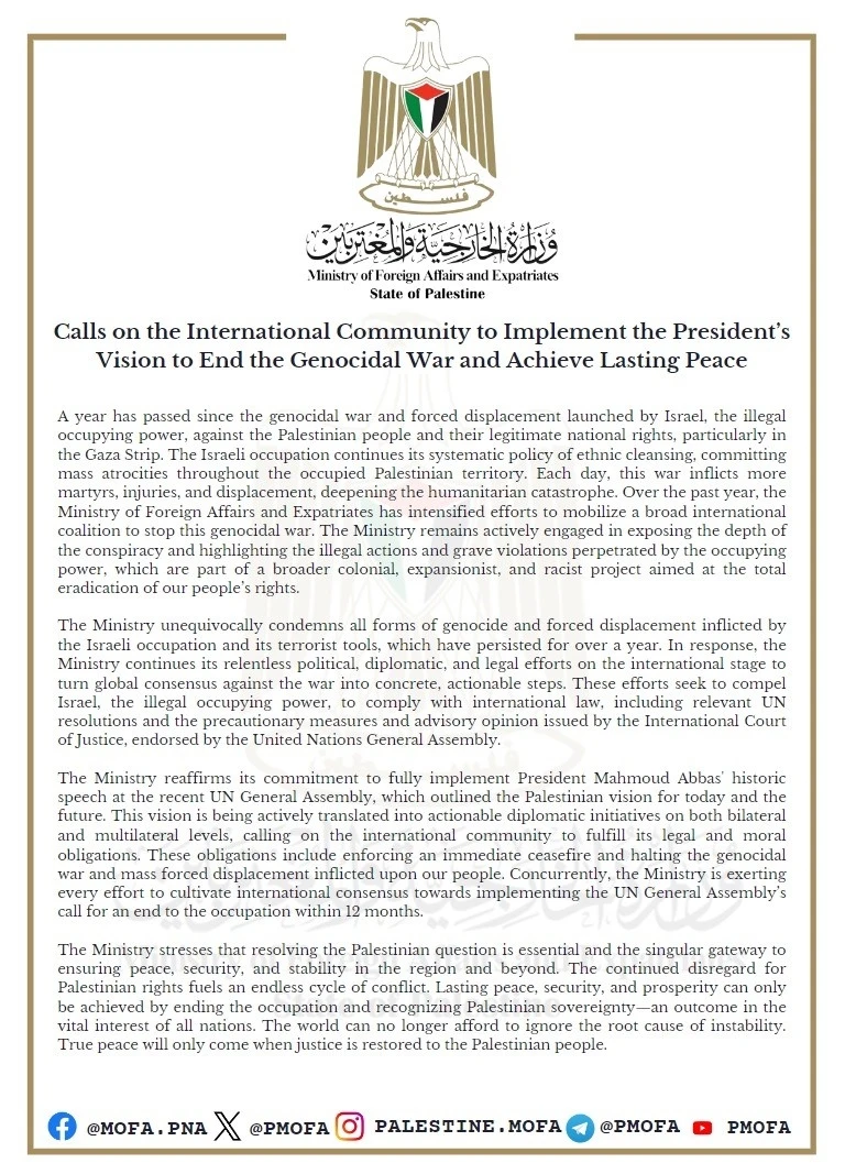 Filistin Dışişleri Bakanlığı’ndan yapılan açıklamada İsrail’in 1 yıldır süren işgali ve soykırımı kınanarak, “Kalıcı barış, güvenlik ve refah ancak işgalin sona erdirilmesi ve Filistinlilerin egemenliğinin tanınmasıyla sağlanabilir” denildi.