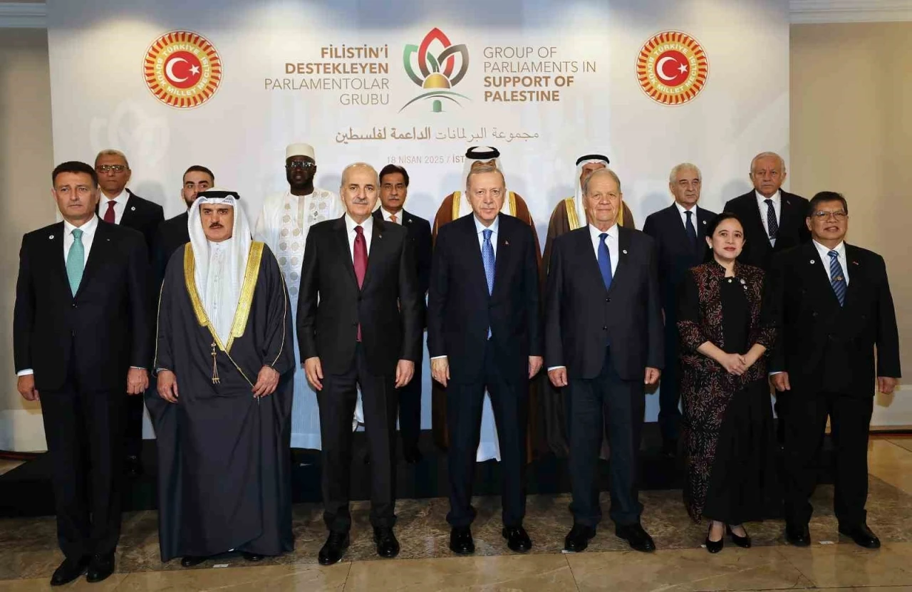 Filistin’i Destekleyen Parlamentolar Grubu Toplantısı, İstanbul’da TBMM Başkanı Numan Kurtulmuş’un ev sahipliğinde Cumhurbaşkanı Recep Tayyip Erdoğan’ın katılımıyla gerçekleştirildi. Toplantı öncesi Cumhurbaşkanı Erdoğan, meclis başkanlarıyla aile fotoğrafı çektirdi ve tek tek meclis başkanlarıyla selamlaştı. Cumhurbaşkanı Erdoğan, toplantıdaki konuşmasında Filistin davasını savunmanın sadece mazlum bir halkı savunmak olmadığını, Filistin’i savunmanın insanlığı, barışı ve adaleti savunmak olduğunu belirtti. Erdoğan, Filistin davasının yaklaşık bir asırdır her türlü zulme, barbarlığa ve katliama maruz kalmış bir halkın haysiyet davası olduğunu vurguladı. "Gazeteciler öldürülüyor, uluslararası basın kuruluşları seyrediyor. Çocuklar öldürülüyor, insan hakları savunucuları seyrediyor. Sağlık çalışanları öldürülüyor, Batı dünyası seyrediyor. Yıllardır özgürlükten, haktan, hukuktan, basın hürriyetinden bahsedenler, İsrail’in katliam politikası karşısında tam 18 aydır üç maymunu oynuyor" diyen Cumhurbaşkanı Erdoğan, en küçük bir hadisede ambargo silahını çeken Batılı devletlerin İsrail’e karşı sessiz kaldığını vurguladı.
