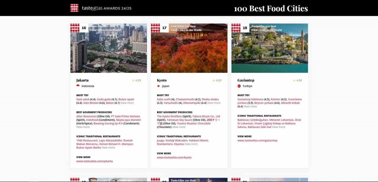Dünyaca ünlü gastronomi platformu TasteAtlas tarafından açıklanan "Dünyanın En İyi 100 Yemek Şehri" listesinde Gaziantep 18’inci sırada yer aldı. Türkiye’den listeye giren bir diğer şehir İstanbul ise 24’üncü sıradan listeye dahil oldu.