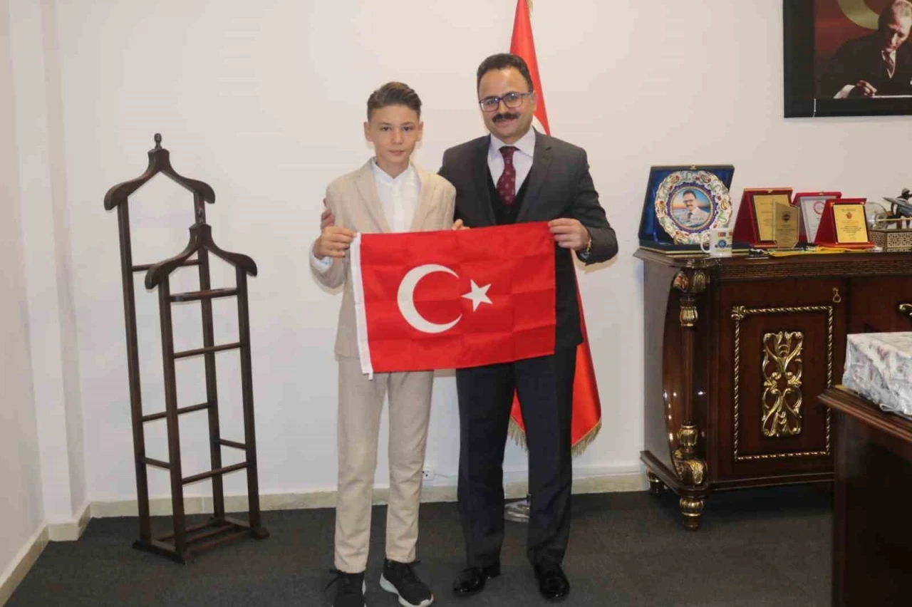 Kütahya’nın Gediz ilçesinde, Kaymakam Hakan Alkan, Ankara’da düzenlenen Atatürk’ü Anma Koşusu Türkiye Şampiyonası’nda Küçük Erkekler 2 bin metre kategorisinde Türkiye Şampiyonu olan Mert Ali Karaoğlan ve ailesini makamında kabul etti.
