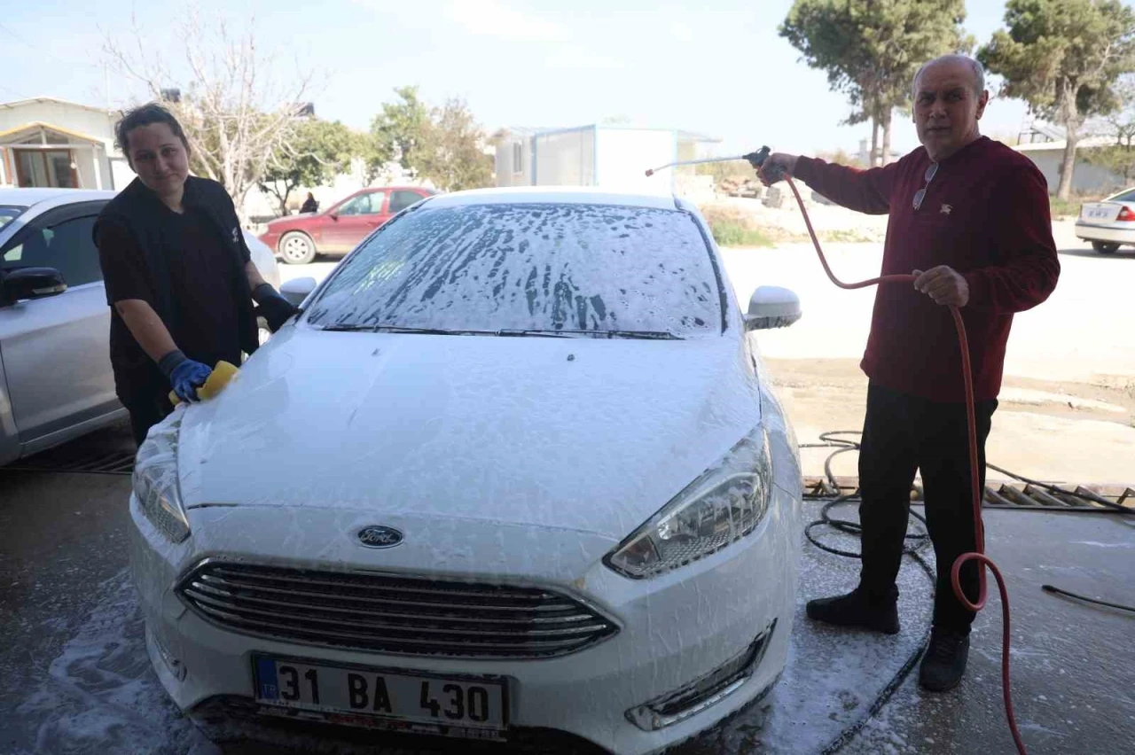 Hatay’da yaşayan Aslı Pekşen Ertürk, 6 ay önce açtıkları oto yıkama iş yerinde kayınpederi olan Selahattin Ertürk ile birlikte mesai yapıyor.