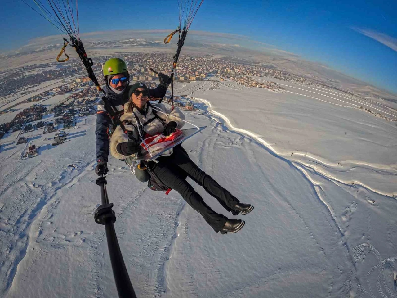 Palandöken’in 3100 rakımlı zirvesinde yamaç paraşütü ile süzülen Neşe Durdi ve Yusuf Okuyucu, Erzurum’un coğrafi işaretli yemeği olan cağ kebabını tadını çıkardılar.