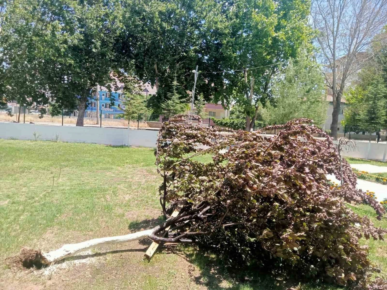 Adıyaman’ın Gölbaşı ilçesinde etkili olan şiddetli rüzgar, bir ağacı kökünden söktü. Meteoroloji Genel Müdürlüğü’nün fırtına uyarısında bulunduğu bölgede vatandaşlar tedirgin oldu.