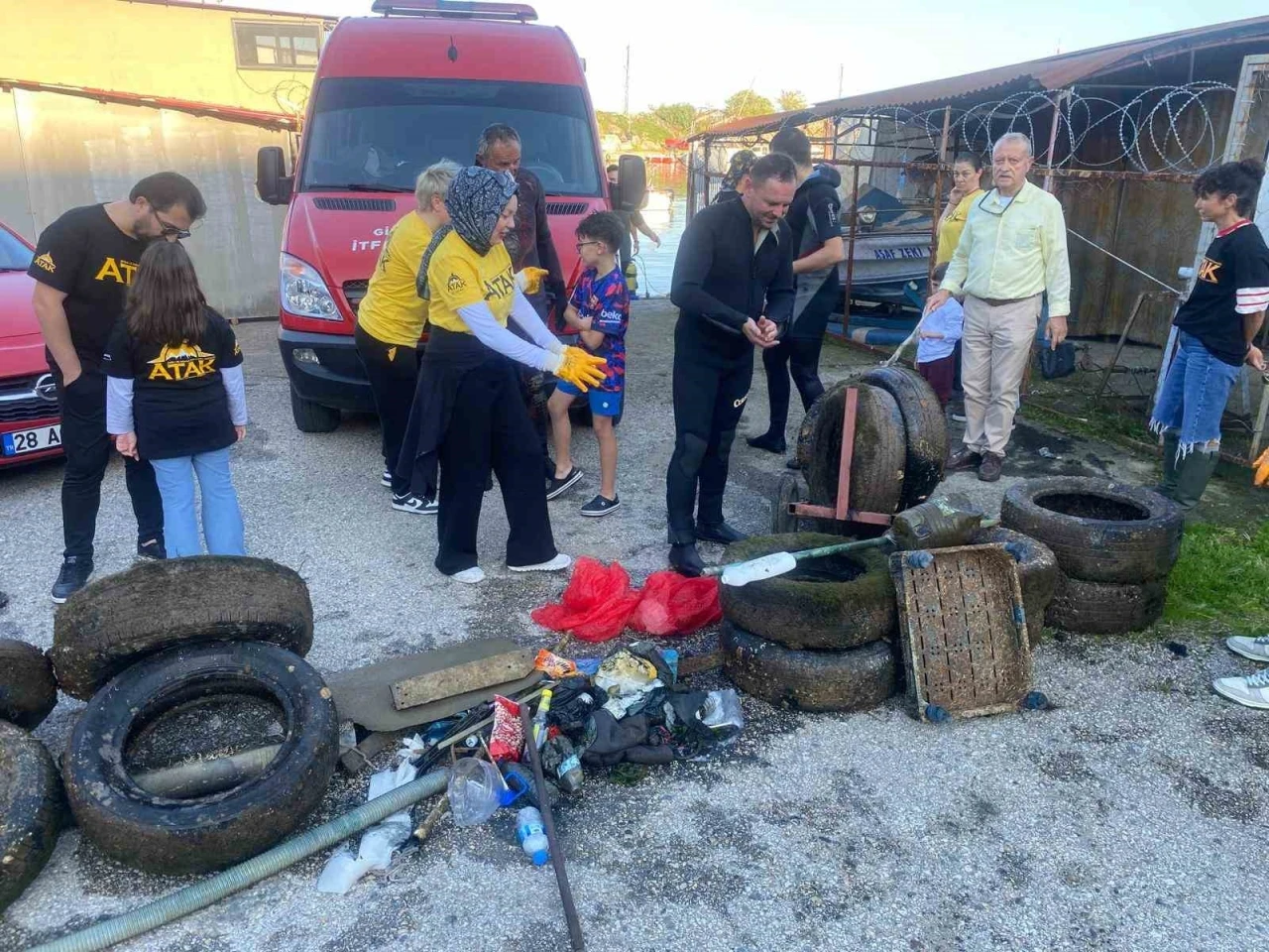 Giresun’un Gemilerçekeği Üçkayalar Balıkçı Barınağı’nda düzenlenen çevre etkinliğinde, deniz tabanında biriken atıklar gönüllüler tarafından temizlendi.