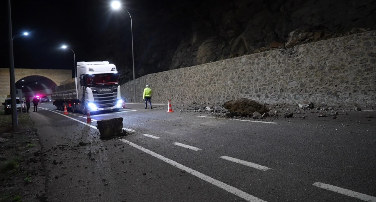 Gümüşhane’de aynı güzergâh üzerinde ikinci kez meydana gelen heyelanda dev kayalar yola savruldu.