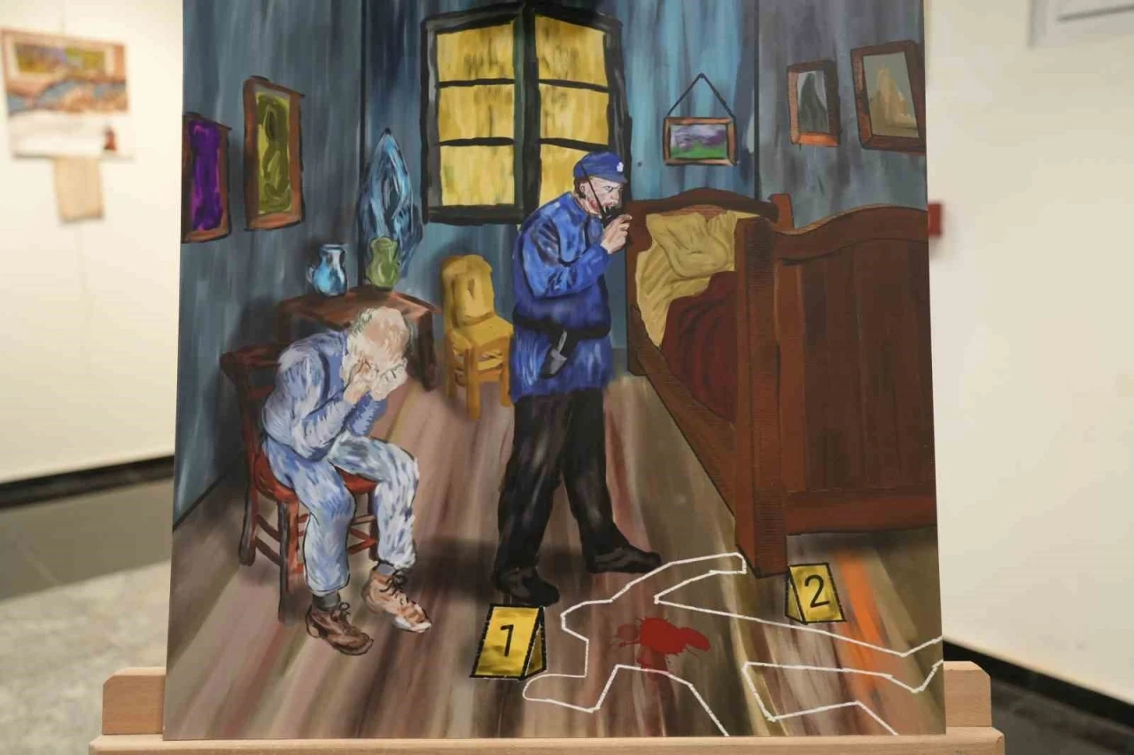 Uzun yıllar boyunca resim çizdiğini ve son 3 senedir profesyonel olarak çalışmalar yaptığını ifade eden polis memuru Bekir Akçagöz, "Polis genellikle toplumda tek yönlü olarak bilinir. Sadece polis kimliğiyle tanınır. Bizim amacımız sadece polis kimliği ile değil, farklı şeyler de yapabildiğini göstermek. Daha derinliği, daha estetik kaygısı olduğuna değinmek. Diğer polis arkadaşlarımıza emsal teşkil etmek istedik. Sergide benim yağlı boya, kuru fırça çizimlerim var. Tükenmez kalem çizimlerim var. Diğer polis arkadaşımın dijital çizimleri var. Minyatür çalışıyor. Modern sanatı ve dijital sanatı, eski sanatı birleştirmeye çalışıyor. Güzel eserleri var onun da. Ben küçüklüğümden beri resim çiziyorum. Ama bunu profesyonel denilecek seviyeye yaklaşık 3 yıl önce getirdim. Polislikten kalan boş zamanlarda sanatla uğraşabiliyoruz, çizim yapabiliyoruz" dedi. "Ünlü tabloları polislikle bağdaştırarak karikatürize ediyorum"
