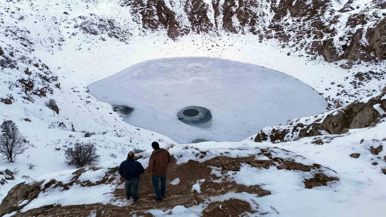 Sivas’ta bulunan ve güneşin konumuna göre renk değiştiren Kızılçan Gölü, soğuk havanın etkisiyle dondu. Sivas’ın en büyük krater göllerinden biri olan Kızılçan Gölü’nde kartpostallık görüntüler oluştu.