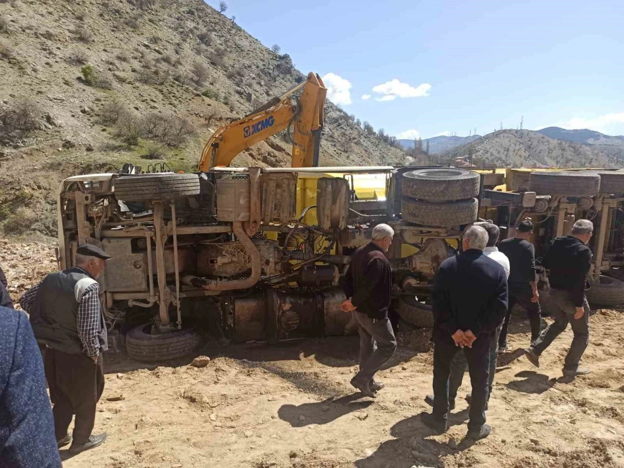Adıyaman’ın Sincik ilçesinde boşaltım yapan hafriyat kamyonu devrildi.