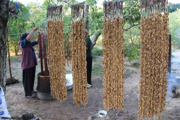 Konya’nın Halkapınar ilçesinde yöresel yiyeceklerin başında gelen cevizli bandırma yapımları başladı.