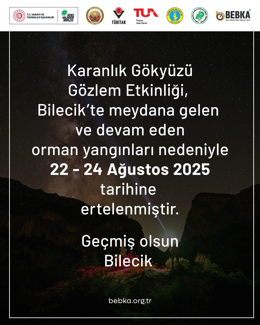 Bursa Eskişehir Bilecik Kalkınma Ajansı (BEBKA), Bilecik ve Eskişehir’de meydana gelen ve halen devam eden orman yangınları sebebiyle, 25-27 Temmuz 2025 tarihlerinde gerçekleştirilmesi planlanan Harmankaya Kanyonu Tabiat Parkı Karanlık Gökyüzü Gözlem Etkinliği’nin 22-24 Ağustos 2025 tarihlerine ertelendiğini duyurdu.