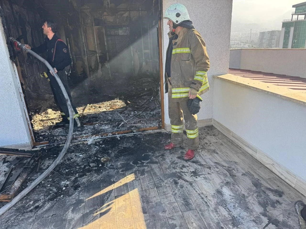 Hatay’da depremde hasar gören bir binanın en üst katında çıkan yangın itfaiye ekipleri tarafından söndürüldü.