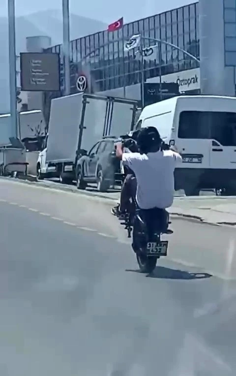 Olay, İskenderun-Antakya yolu üzerinde meydana geldi. Kimliği henüz belirlenemeyen motosiklet sürücüsü, trafikte seyir halindeyken ön tekeri havaya kaldırarak uzun süre bu şekilde ilerledi. Sürücünün bu tehlikeli gösterisi yolda seyreden başka bir araçtakiler tarafından cep telefonu kamerasıyla kaydedildi. Görüntülerde, motosikletlinin yoğun trafikte yaptığı hareketle hem kendi hayatını hem de çevredeki diğer sürücüleri riske attığı açıkça görülüyor. Trafik kurallarını hiçe sayan sürücünün kimliğinin tespit edilip, gerekli işlemlerin yapılması için yetkililerin çalışma başlattığı öğrenildi.