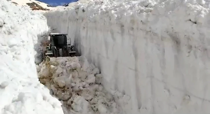 Hakkari’nin Yüksekova ilçesindeki İkiyaka Dağları bölgesinde haziran ayına rağmen kalınlığı 6 metreyi bulan karda yürütülen yol açma çalışmaları devam ediyor.