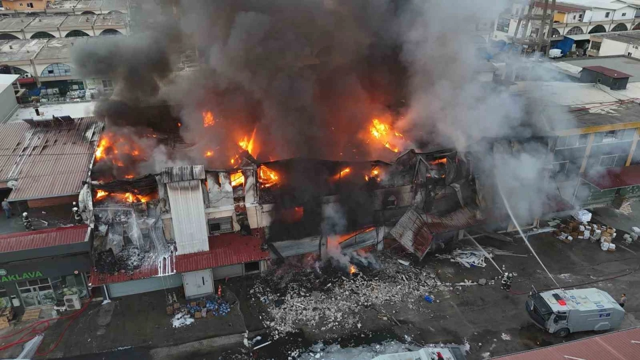Söndürme çalışmalarına Toplumsal Olaylara Müdahale Aracı (TOMA) da katıldı. Bitişik iş yerlerine de sıçrayan yangını söndürme çalışmaları sürerken yangın, dron ile havadan görüntülendi.