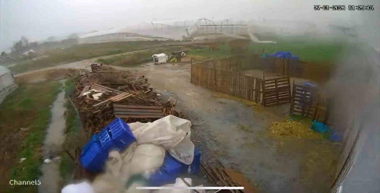 Antalya’nın Serik ilçesinde meydana gelen hortumun serayı saniyeler içinde yerle bir ettiği anlar güvenlik kamerasına yansıdı.